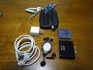 この袋の中身は、①iPhone用電源アダプタ②PCと電源アダプタを結ぶUSBケーブル③サンワサプライの予備バッテリー④サンワサプライのクリップ付コード収納型イヤホン⑤デジカメ用予備バッテリー