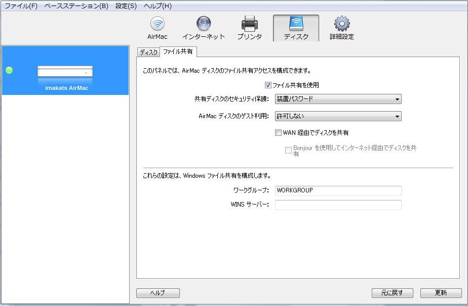 AirMacExtreme外付けディスクは、Mac miniでMacOS拡張(ジャーナリング)でフォーマットを行い、その後、AirMacExtremeに接続した。WinPCからは、AirMacユーティリティを再起動すると見えるが、数時間?経つとダメになった。理由が分からない。そこでMacFanの別冊「マックとウインドウズ共存・共有・共栄」を見ていたら、「WAN経由でディスク共有」のチェックをはずしてあった。なので、そう変えてみた。そうしたら、2日ほど経つが途切れることなく使えるようになった。これでいいのかな。