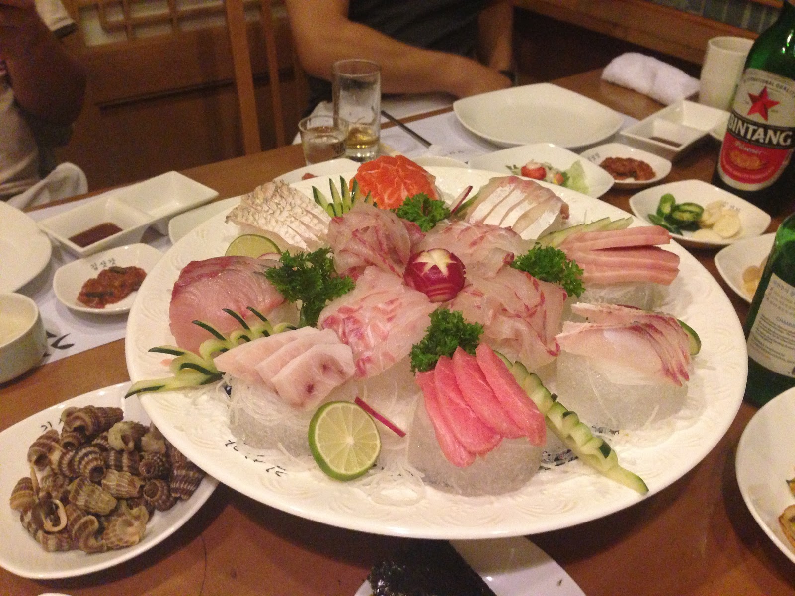 ジャカルタの韓国料理屋で刺身です。おまかせコースにすると刺身で腹一杯になります。全く大丈夫です。腹痛になったことはないです。私は。Kim Sat Gatという店。