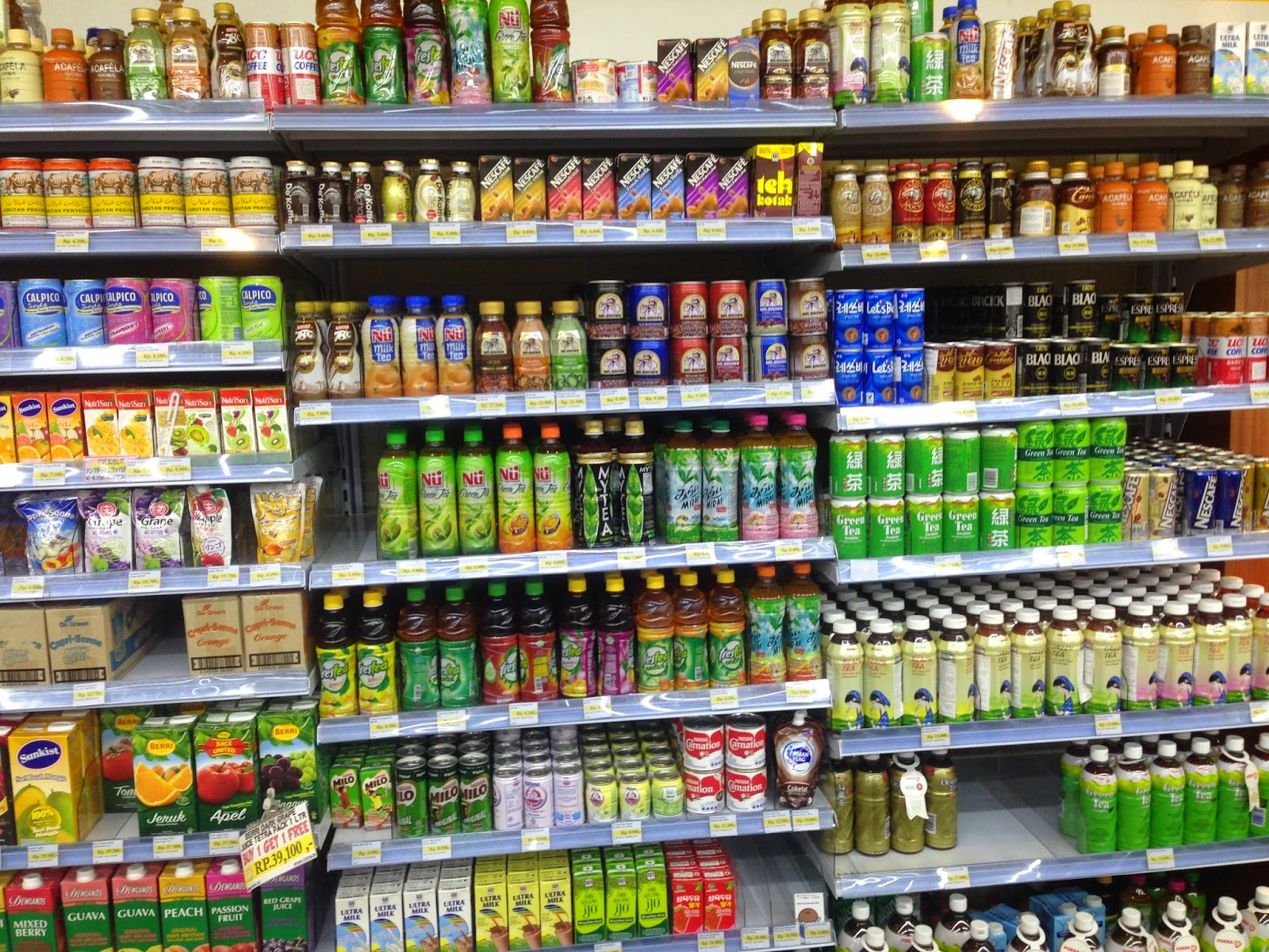 シェアはどんな? 2014.10.19 ジャカルタのスーパー、飲料の棚です。都市部ではだいたいこんな品揃えだと思いますが、メーカーとしては、日本30%、韓国25%、欧米25%、インドネシア20%くらいのシェアです。