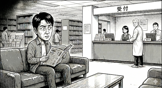受付の真正面から約10m先、そこに新聞や雑誌を読めるコーナーがあった。