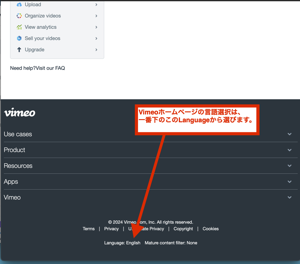 Vimeoホームページを日本語表示にする方法が、意外にわかりにくいです。実は、Settingsのページの一番下、フッターの位置に、言語選択があります。