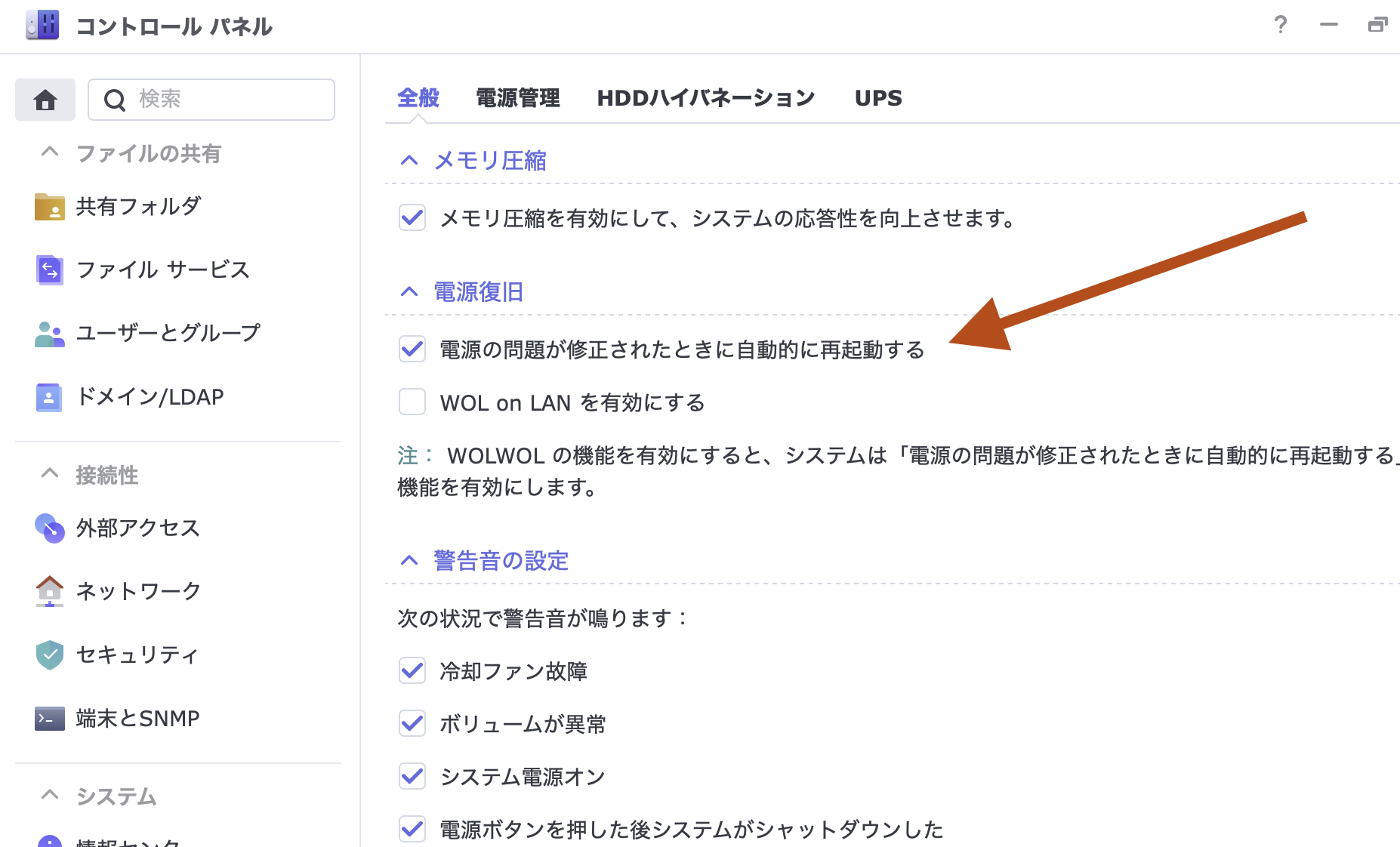 NAS自体は大抵、停電の際に自動再起動できるようになっています。但し、停電が起きた時には、パスンと切れてしまい、デバイスやファイルに障害が発生しやすいです。特にWebサーバーは、常時、外部に向け発信しているため、サービスを安定させるために、自動シャットダウンをUPSで行えるようにしておくことを、おすすめします。