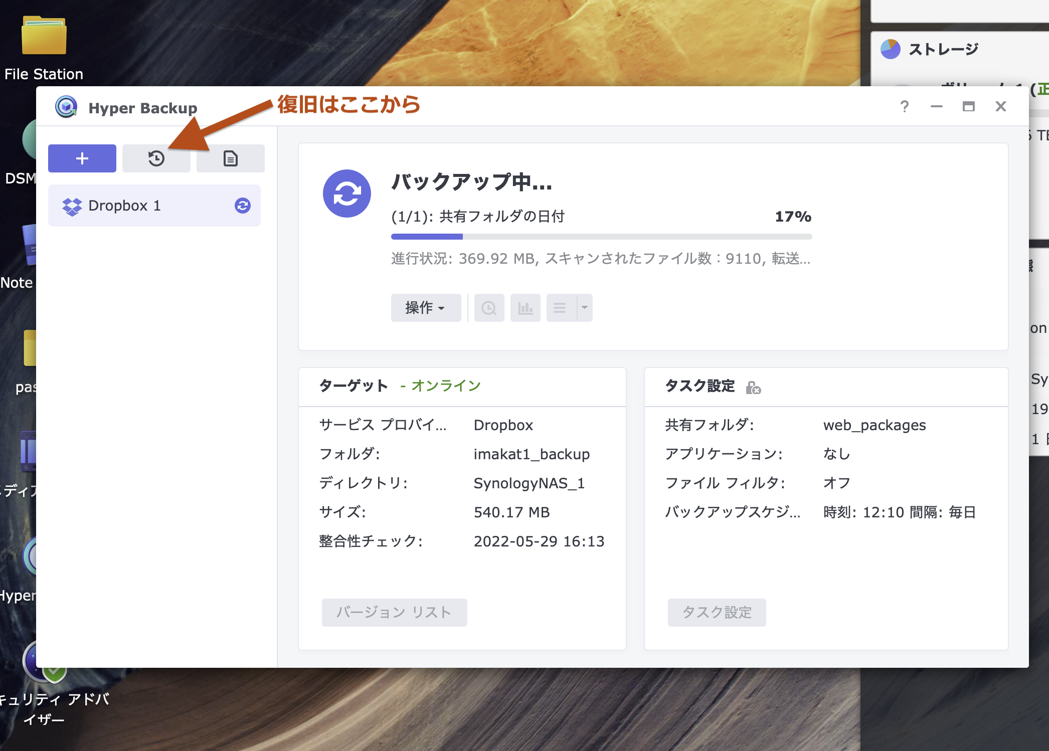こうしておいたとしても、忘れて、うっかり、WordPressのパッケージ更新を押してしまうこともあります。その場合も、「Hyper Backup」から復元タスクを行なってください。