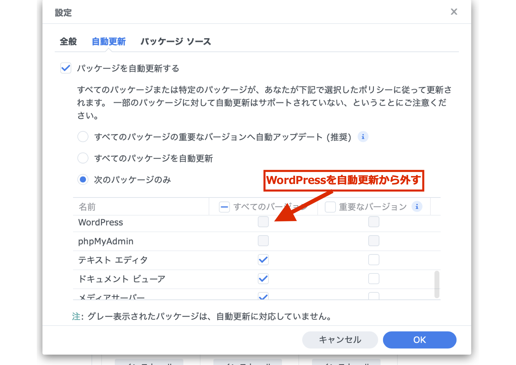「パッケージセンター」「設定」「自動更新」の中で、WordPressを自動更新から外してください。