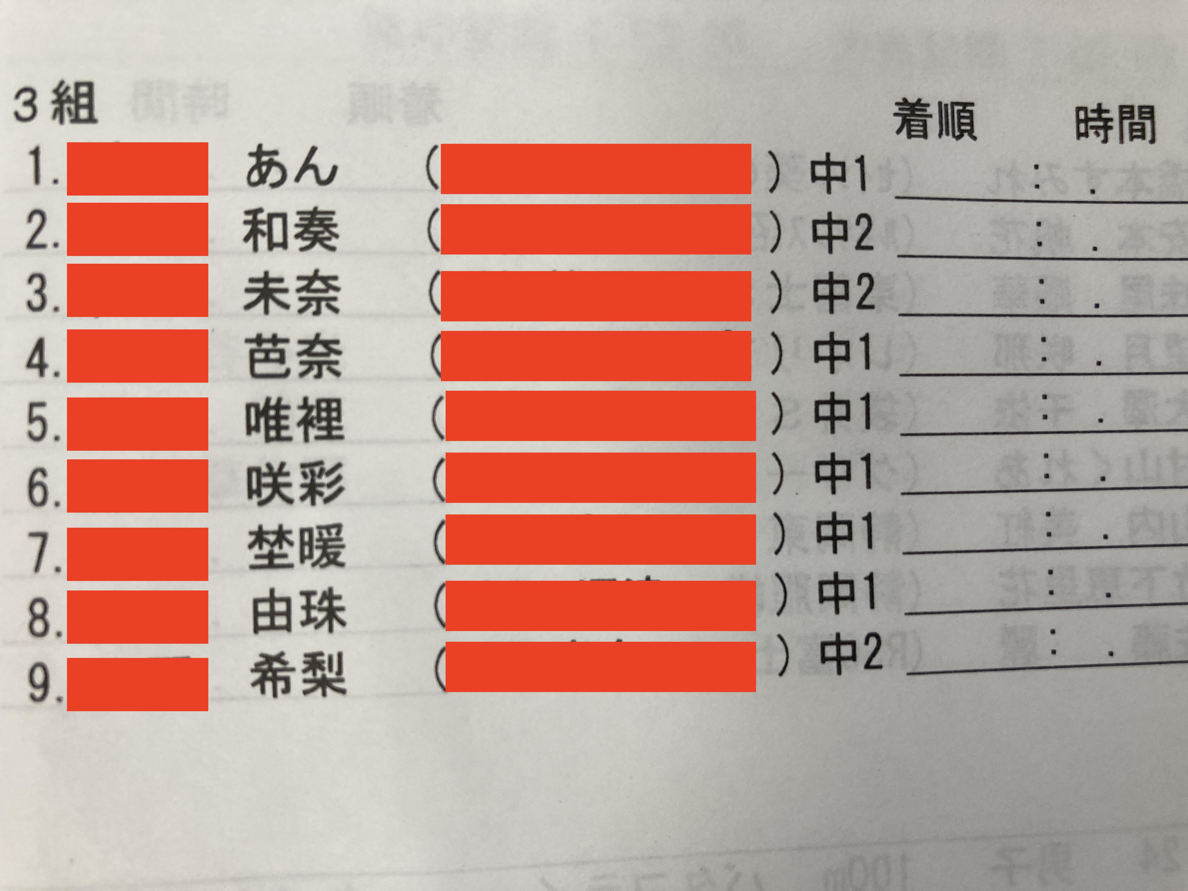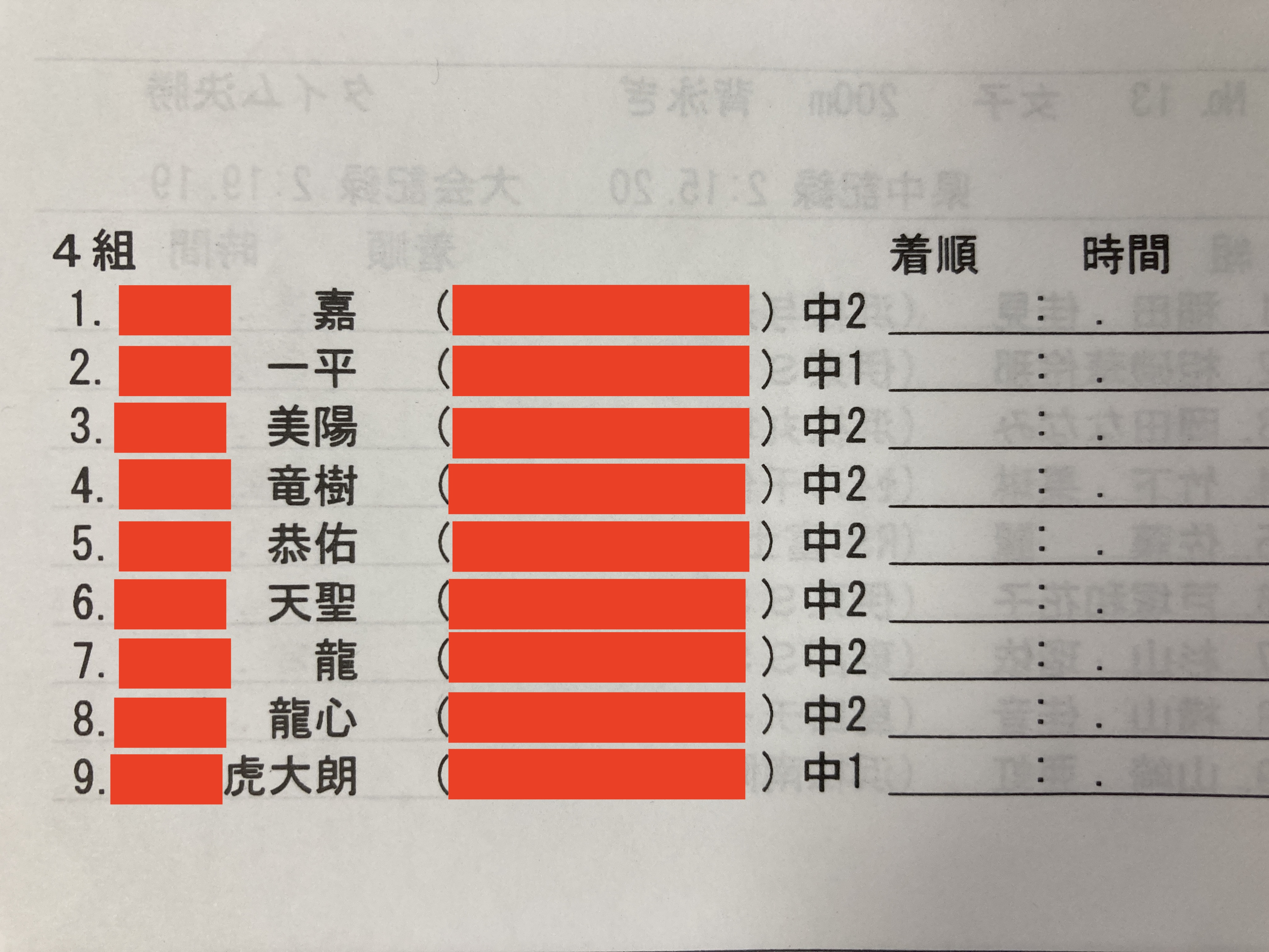 召集係については、やったことがありますが、所属名と名字だけで確認、0レーン「※*中学」の「スズキ」くん、と、素早くパッパッやるので、名前を呼んでるヒマがない。だから支障はありませんね。