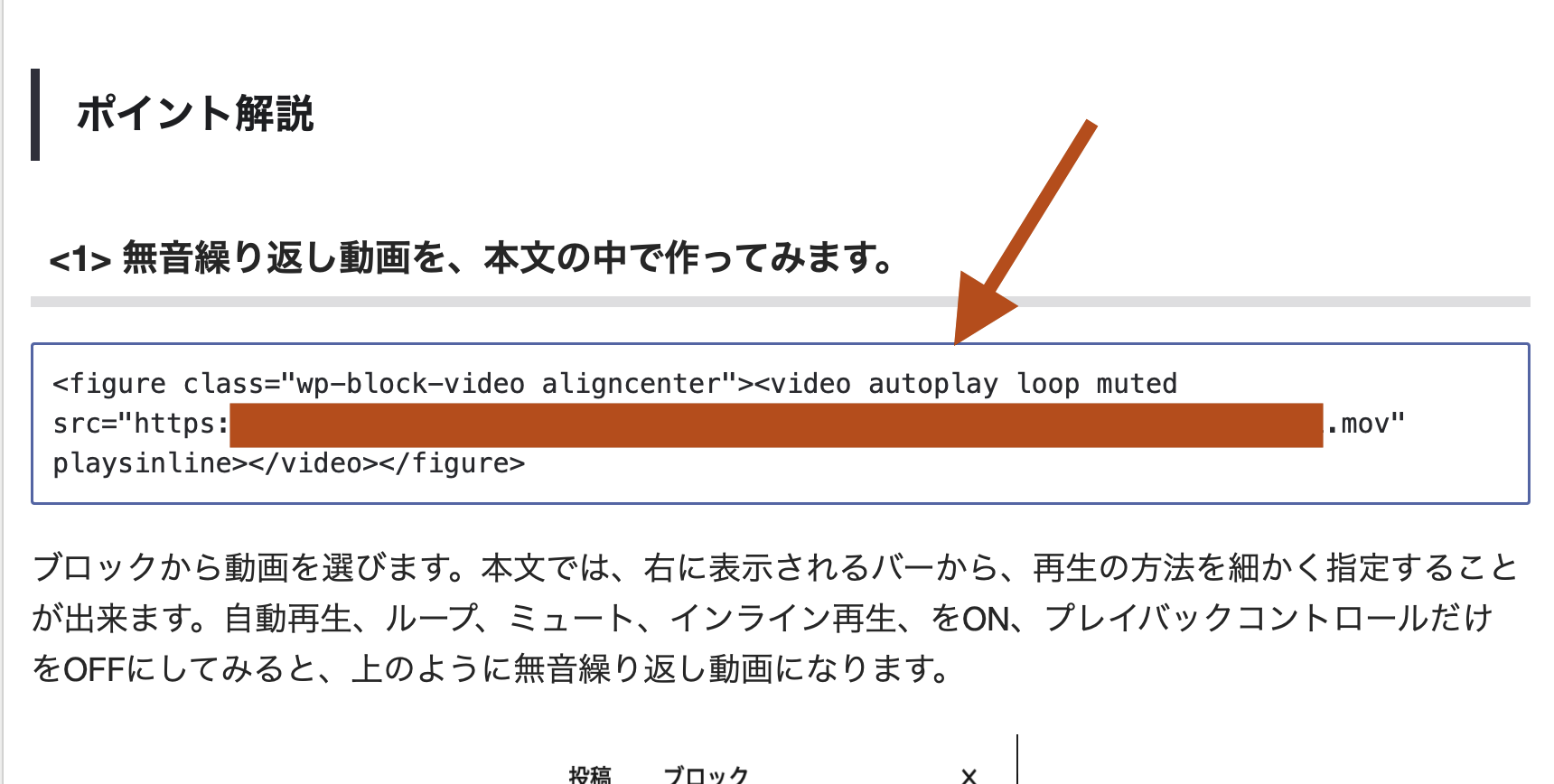 下記のポイント解説の中に動画貼り付けがありますが、この動画ブロックを、HTML記述に変更してコピーしただけです。