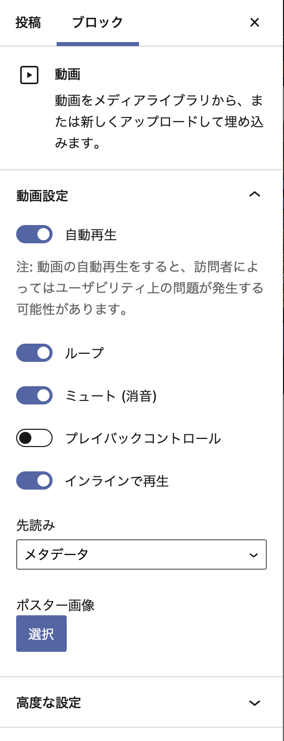 ブロックから動画を選びます。本文では、右に表示されるバーから、再生の方法を細かく指定することが出来ます。自動再生、ループ、ミュート、インライン再生、をON、プレイバックコントロールだけをOFFにしてみると、上のように無音繰り返し動画になります。