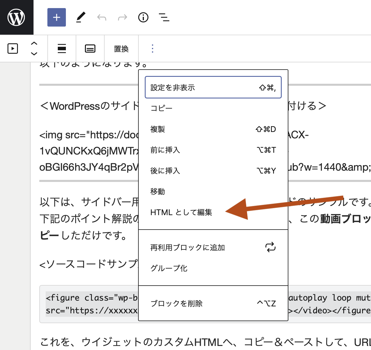 貼り付けた動画をクリックすると、バーに点3つのマーク→HTMLとして編集、を選びます。