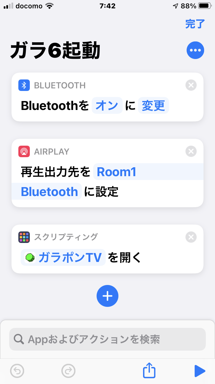 BLUETOOTHの設定からは、再生出力先を選択出来ないので、AIRPLAYの設定からBluetoothスピーカーを選択しています。これでうまく連動します。ここへ更に「SAFARIのURLを開く」をつなげています。「ガラ6起動」と名前をつけました。