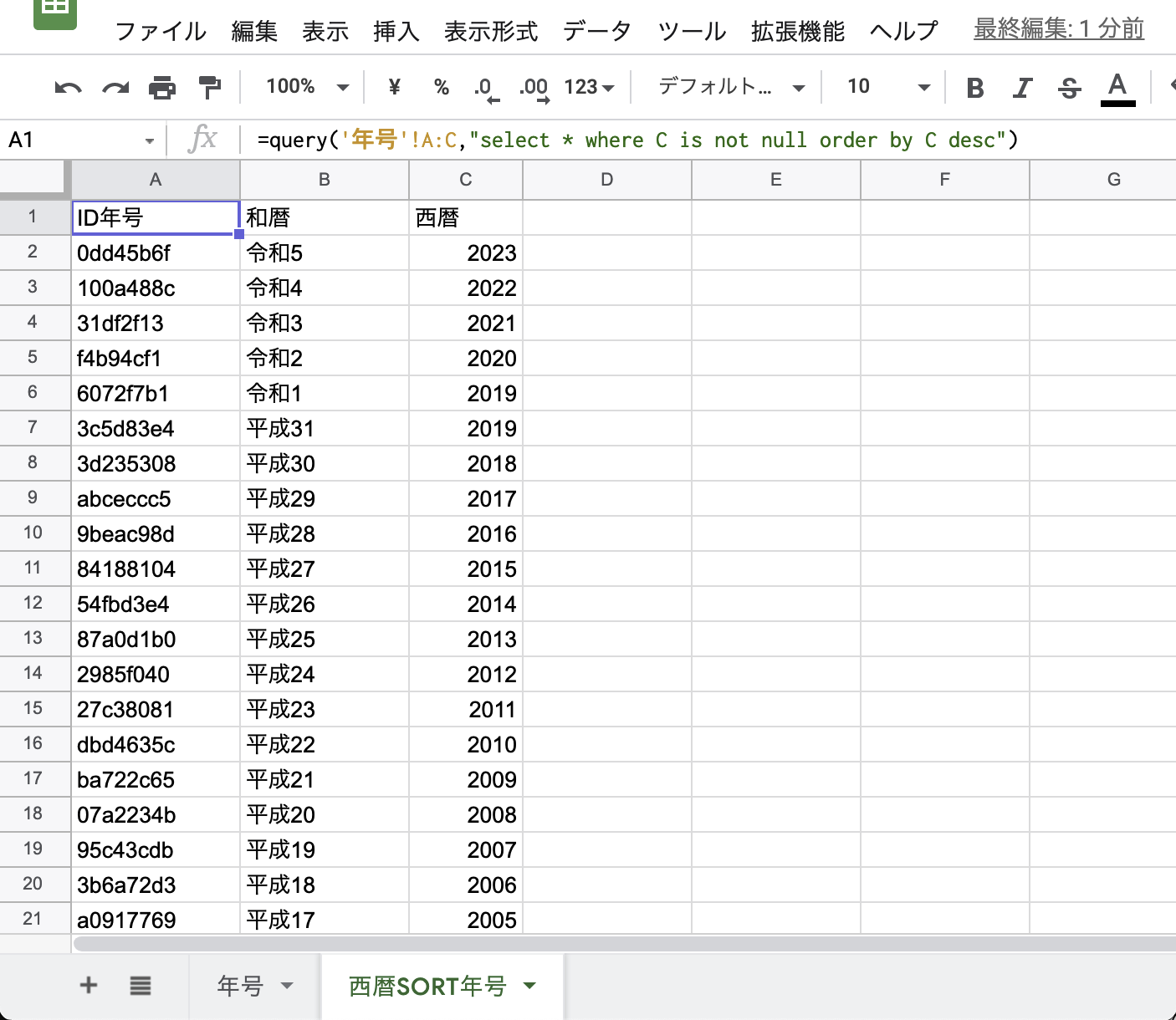 <5>「西暦SORT年号」シートにquery関数を埋め込む。