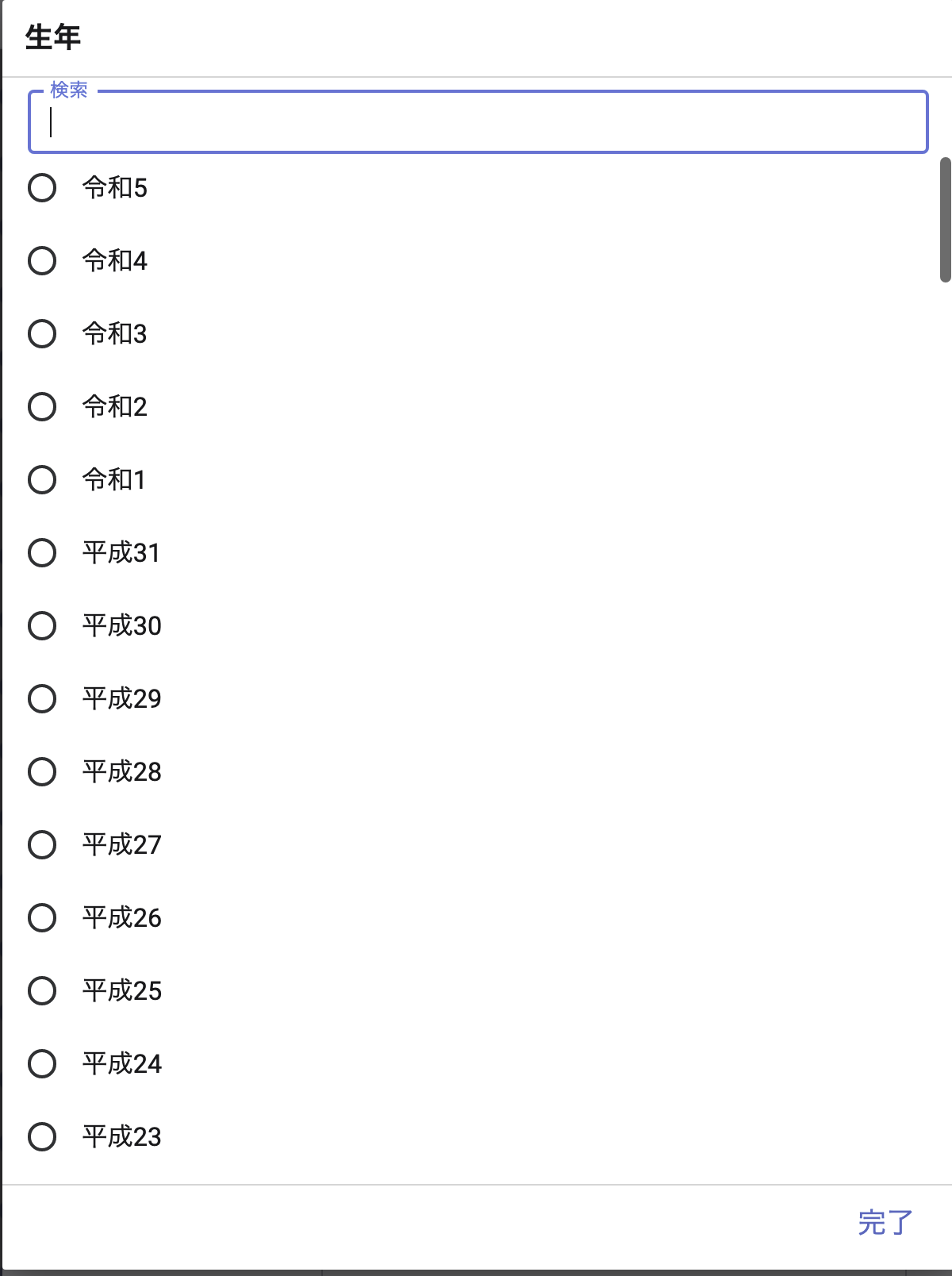 年号のメンテナンスは、「年号」シートへ << Updates Adds Deletes >>で行い、利用する時は、「西暦SORT年号」シートから<< Read-Only >>で利用します。AppSheetの「Columns」設定でKEYを「ID年号」、LABELを「和暦」にします。そうすることにより、以下のように、令和5が先頭に来た選択リストを表示することができます。