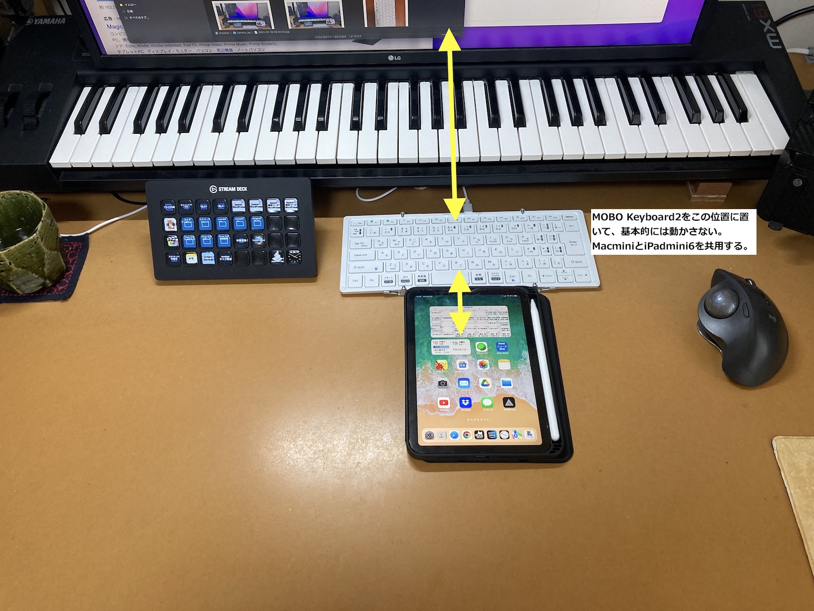 4 もともとMacminiのために常に置いてあるMOBO Keyboard2の手前に、iPadmini6を並べただけのことで、特別なことは何もしていない(ちょっと後付けな言い方)。