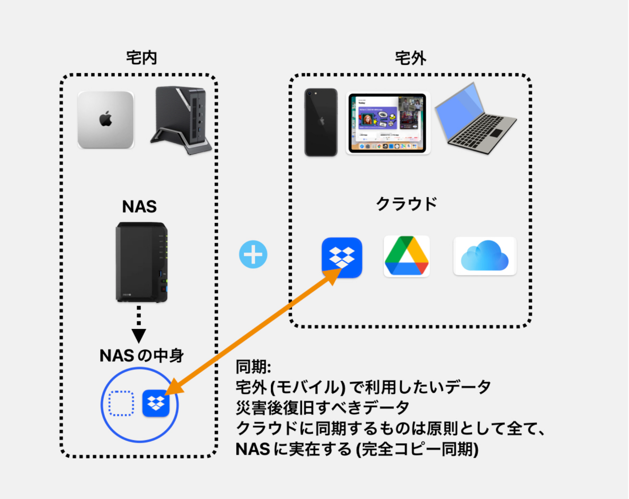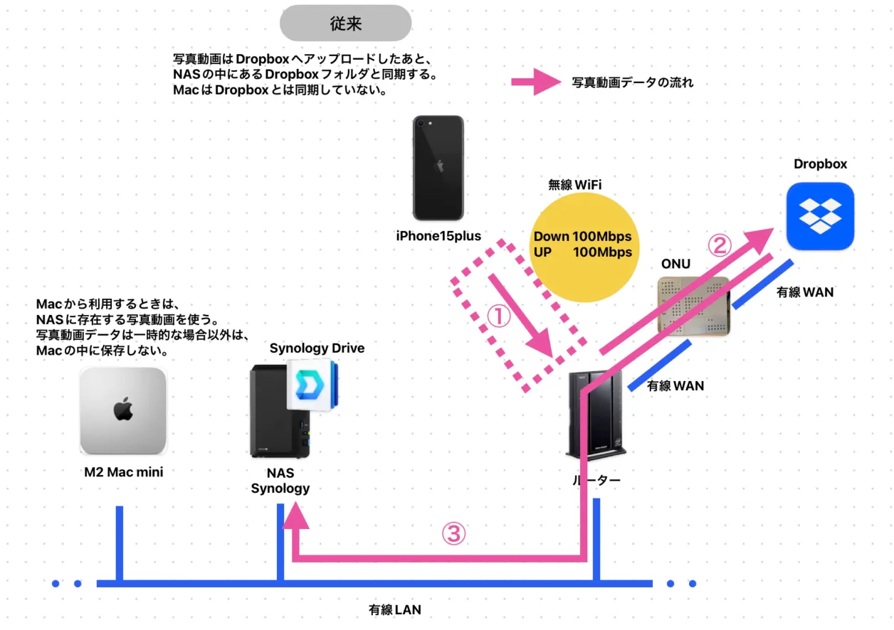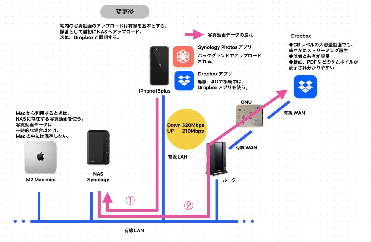 私は、汎用性を考慮してDropboxへアップロードして更にNASへ同期していました(下図)。