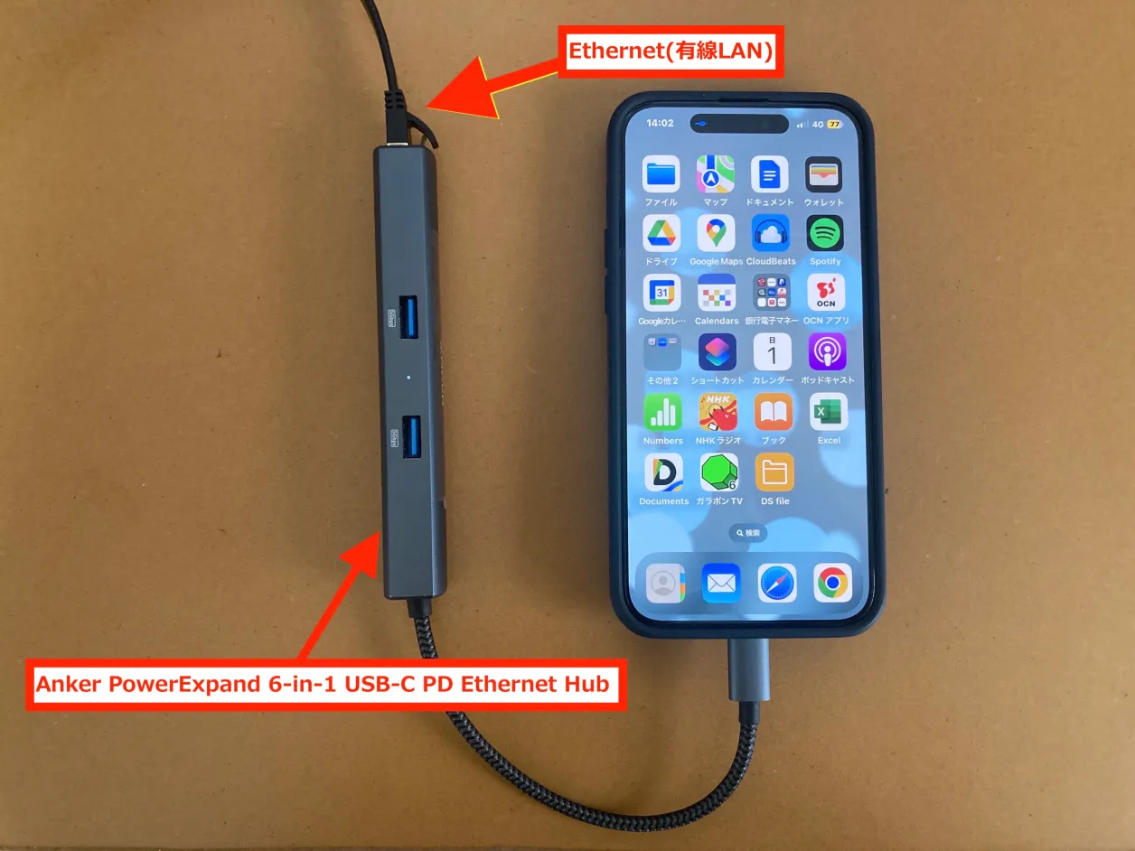 Ethernet(有線LAN)接続は、iPhone15PlusにAnker PowerExpand 6-in-1 USB-C PD Ethernet Hubを接続して行いました。