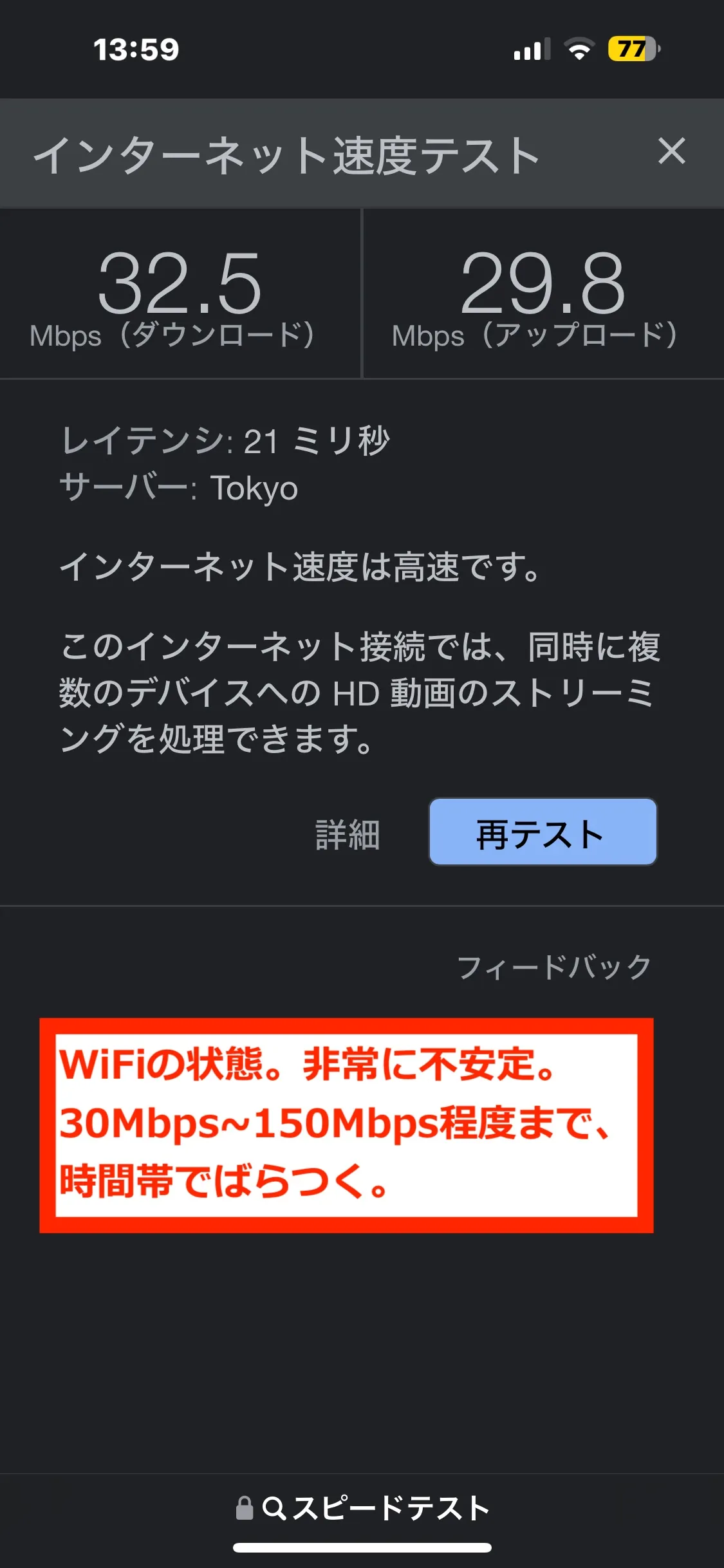 WiFi接続は、例えば、午後2時頃は以下のような状況。速い時は、150Mbpsくらいまで上がりますけど。問題は、場所や時刻によって、非常に振れ幅が大きく不安定なことです。30Mbps~150Mbps程度の振れ幅があります。