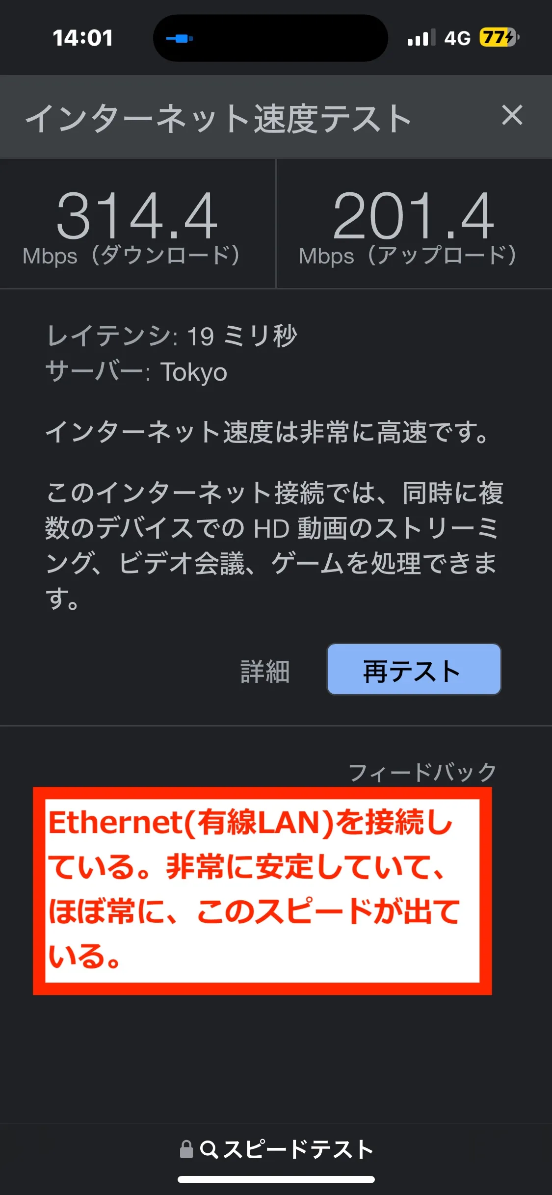 何よりもEthernet(有線LAN)は、スピードの振れが殆どありません。ダウンストリーム310Mbps、アップストリーム200Mbps程度で終日安定しています。WiFiと比較して、ざっくり平均的に、アップストリームは2倍、ダウンストリームは3倍、高速になりました。