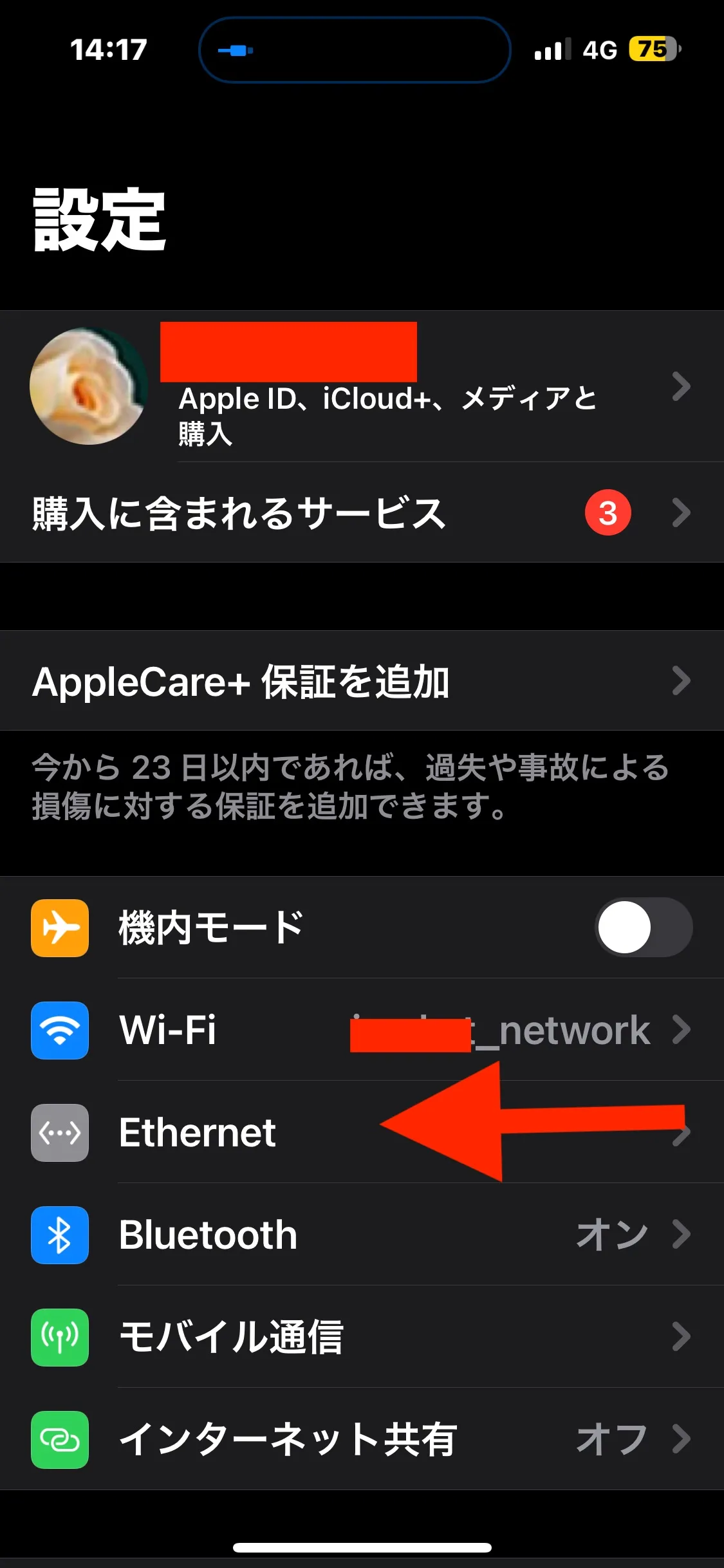 iPhoneの「設定」は何も変更しません。ふだんのWiFi接続の状態にしておいて、そこへEthernet(有線LAN)を挿入します。すると、Ethernetの表示が出現します。しかし、WiFiのネットワーク名は表示されたまま、上のメニューバーは4Gとなっています。一体どれが有効になっているのだろうか。これは、ブラウザからスピードテストで確かめると分かります。この表示状態で、すでに、Ethernetが有効になっています。
