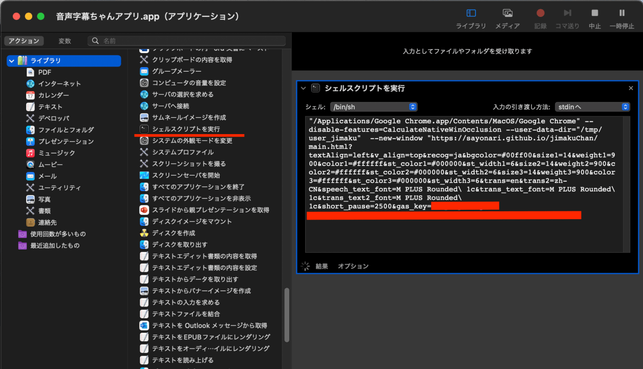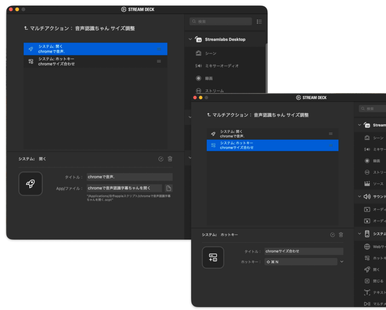 二つのアクションを登録します。一つ目は、Chromeで「音声認識字幕ちゃん」を開く、Appleスクリプトです。二つ目は、そのChromeのサイズを合わせるアクションです。私はStream Deckを使いますが、他にもホットキー、ショートカットを登録できるアプリがありますので、活用ください。