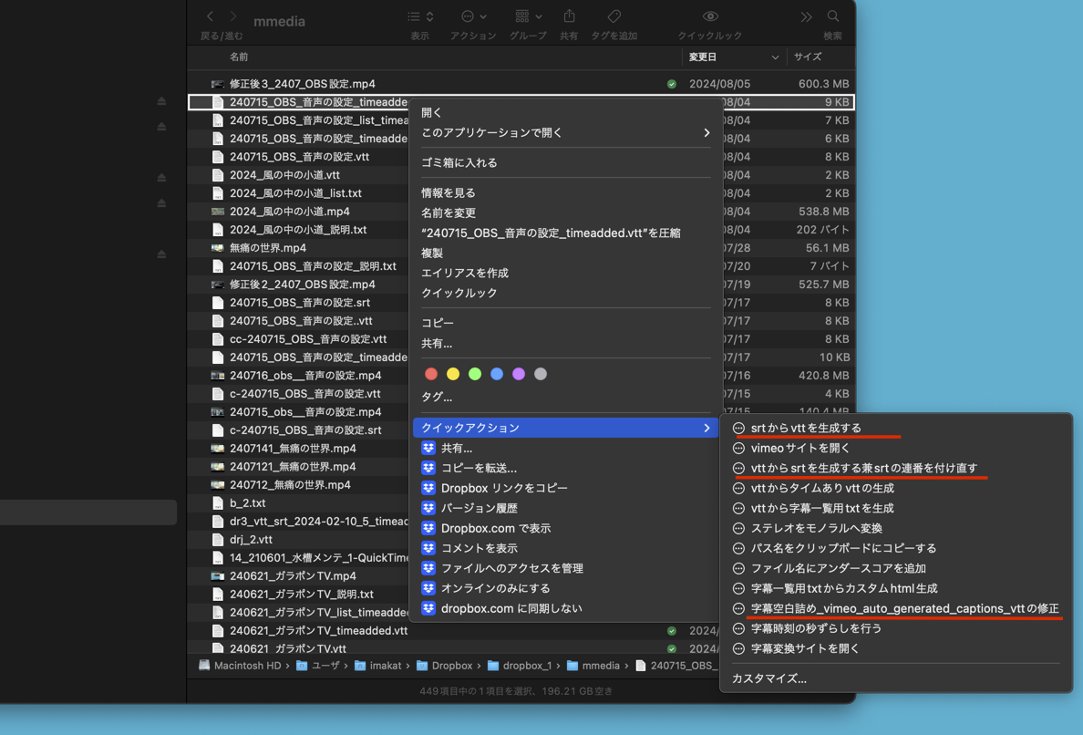 vttからsrt生成、srtからvtt生成についても、あちこちで変換ツールが提供されていますが、Macとして一番使いやすいのは、Finderから対象ファイルの上で右クリックで操作できるのが一番ラクです。そのためのAppleスクリプトは以下です。ご利用ください。