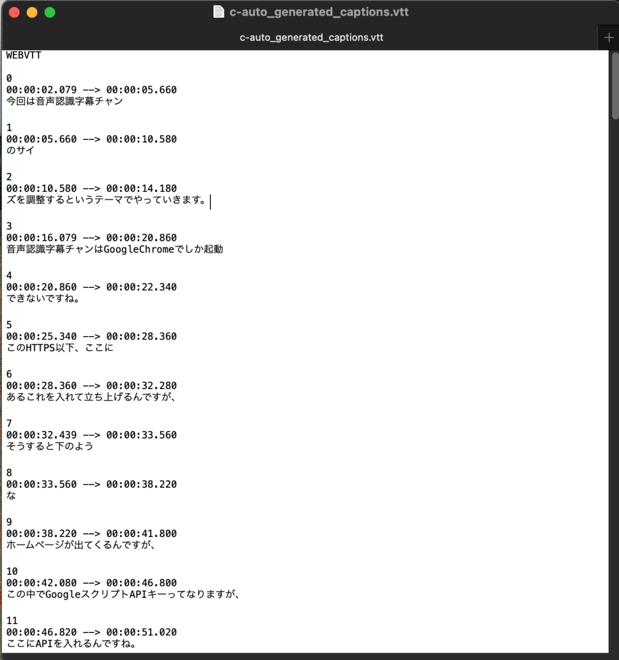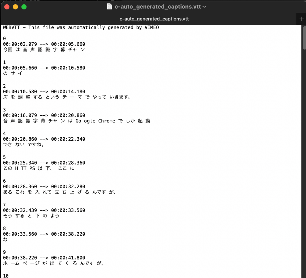 ところが、自動生成したものは、下のように、文字と文字の間に、不規則に、空白が入っており、このまま使いたくありません。それから、auto_generated_captions.vttとしてダウンロードされます。つまりvttファイルです。それと連番が0から始まっています。srtは連番は1から始まる必要があり、Final Cut Proで使うためには変換が必要になります。これも全体の流れを複雑にしている理由でもありますが。
