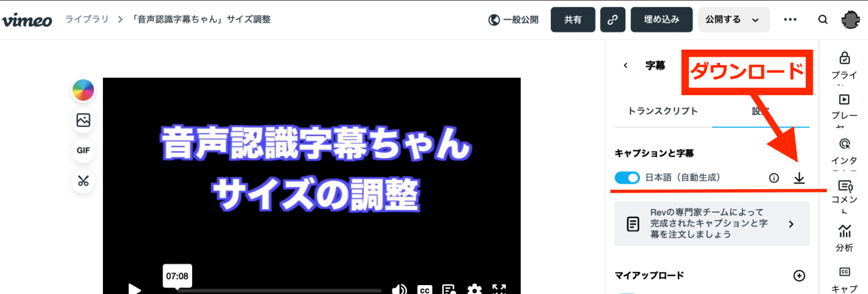1 Vimeoの日本語(自動生成)を利用しダウンロードします。ところが。