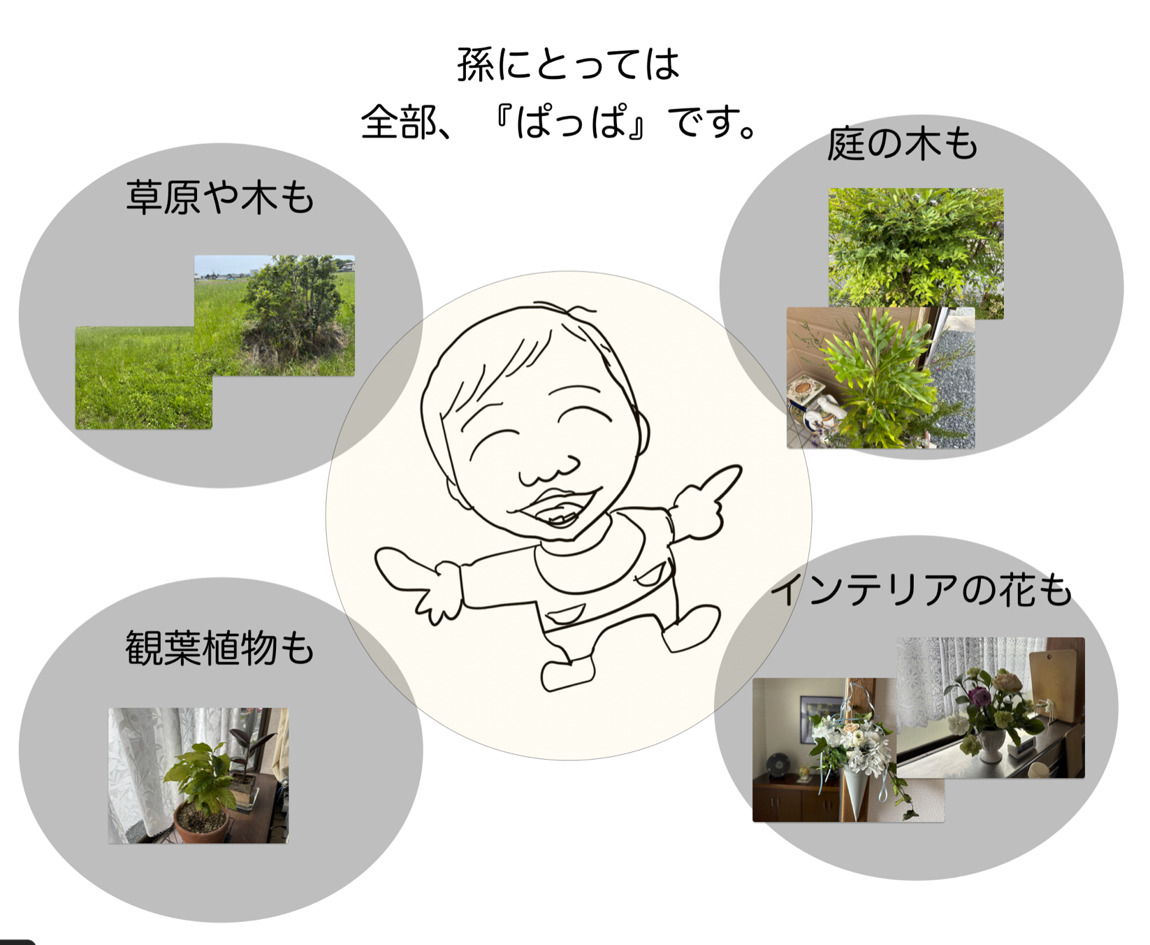 「ぱっぱ」「ぱっぱ」と話します。孫が認識する「ぱっぱ」は、畑、草原、雑草、木々、花。そういった植物全般を見ると、指差して、何でも「ぱっぱ」と大きな声で呼ぶのですね。