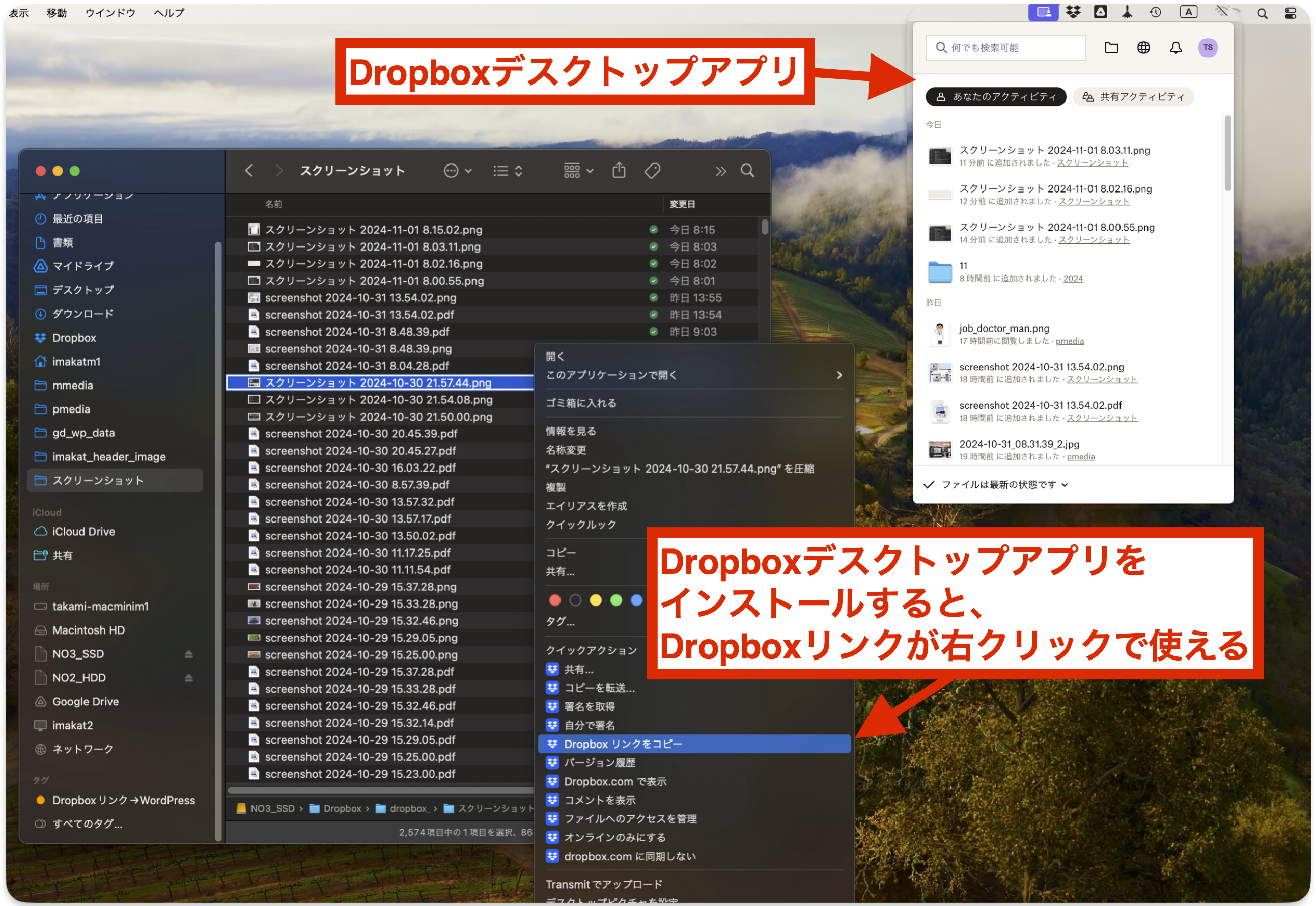 その点、MacやWindowsでは、デスクトップアプリが提供されているため、以下のように、MacのFinderからでも、Dropboxリンクが取得できます。GoogleDriveでも同様に、リンク取得が可能です。