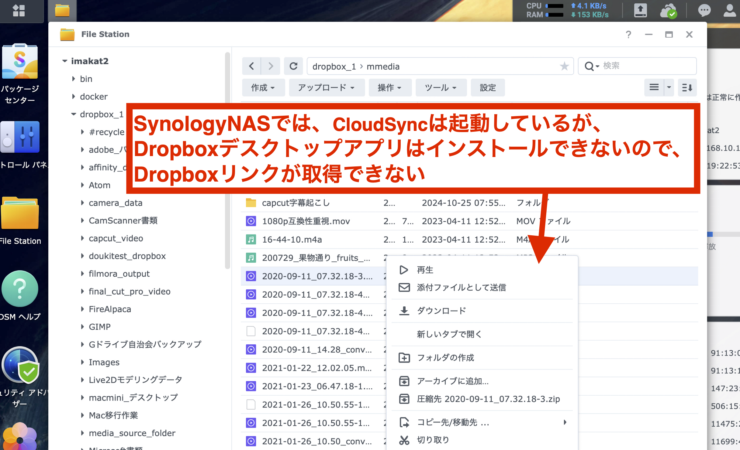 Dropboxにある写真や動画をWordPressへリンクするためにDropboxリンクを取得しようとするとき、Dropbox.comのサイトから入るのはちょっと手間がかかり過ぎです。Dropboxのローカルファイルから右クリックで取得できれば簡単です。SynologyNASは、そのフォルダをDropboxと同期することはできますがしかし、SynologyNASのDropboxのフォルダからは、それを右クリックしてもDropboxリンクの取得はできません。Dropboxデスクトップアプリが提供されていないためです。この辺りが、SynologyNASをパソコン的に使えないと感じる部分です。