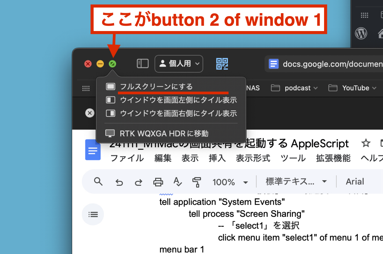 細かい話になりますが、スクリプトの最後のステップに、ウインドウをフルスクリーンにするアクションがあります。その際、フルスクリーンボタンの番号は、表示場所とは必ずしも一致しない点は、記憶に留めておくと良いでしょう。現状、ウインドウのボタンは3つ並んでいます。そのうちで今回目的のフルスクリーンのボタンは右端にあります。3つあってそのうち右端なので、ふつうは、1または3だな、と思うじゃありませんか。ところが違うのですね。正解は2です。今のところ、そのような仕様になっています。試行錯誤で見つけ出すことになります。