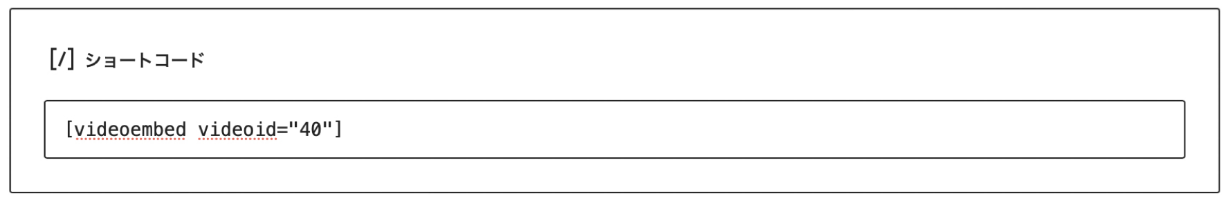 以下のようにショートコードブロックに、ショートコードを埋め込むようにして、””のvideoid(動画id)の部分を書き換えれば、動画がサクッと置き換わるようになります。