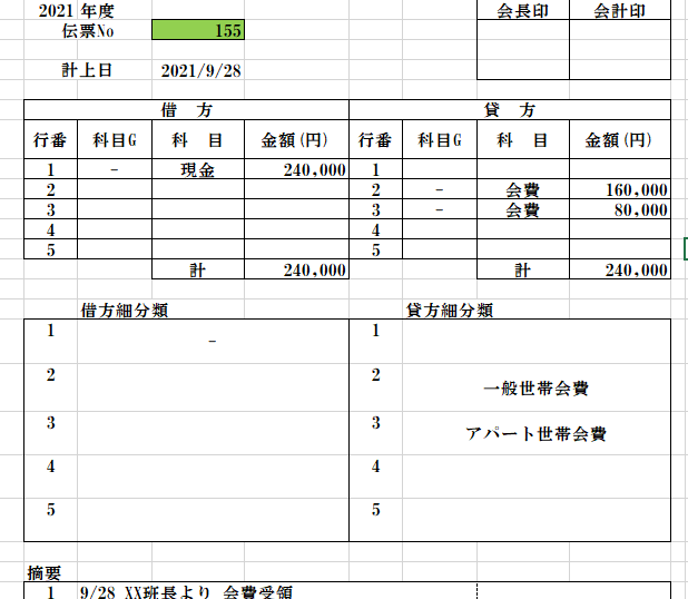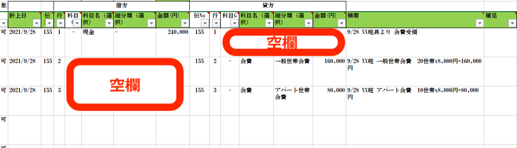 2、3行目は、借方へ、計上日、伝票No、行Noだけを入れます。貸方へ科目名「会費」「細分類」を選び、金額を入れます。摘要を記入します。