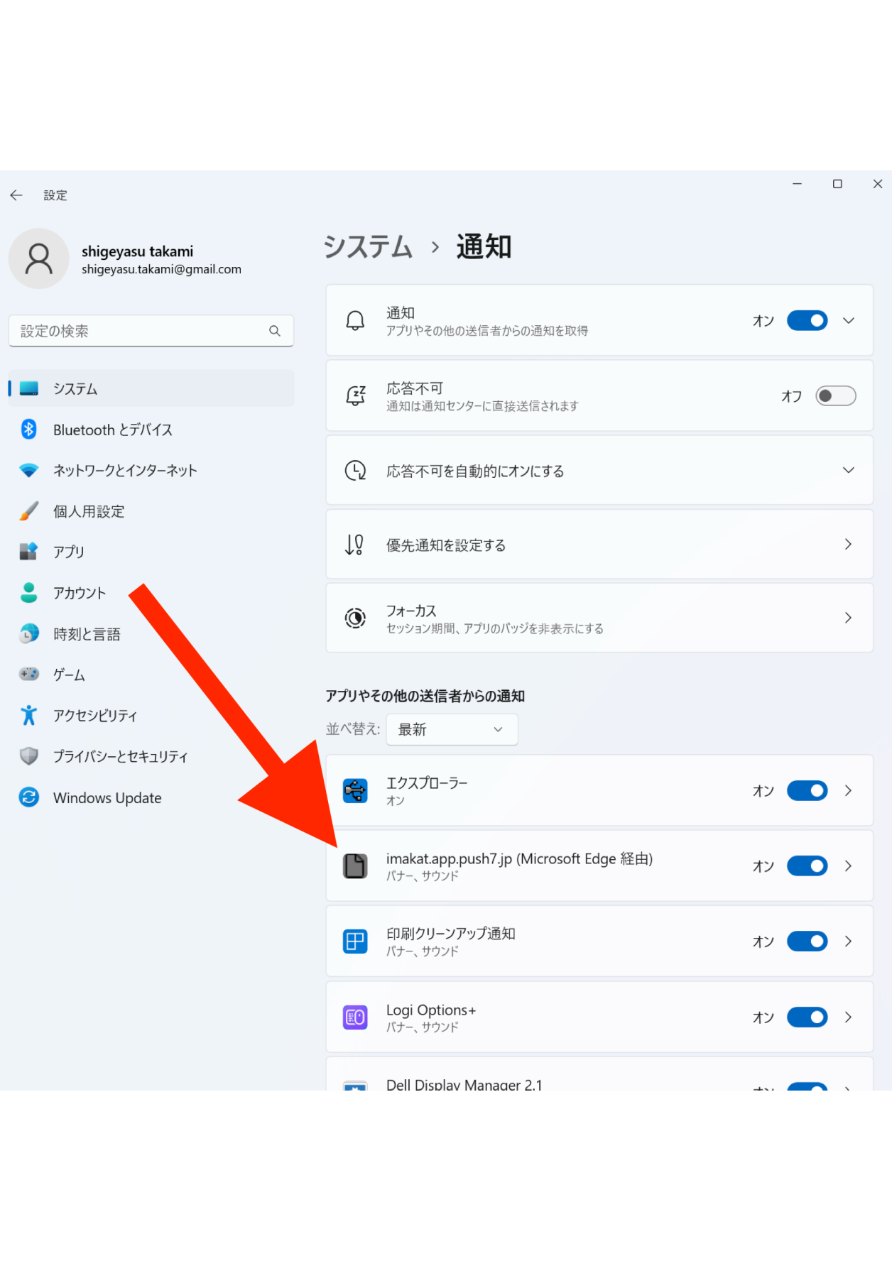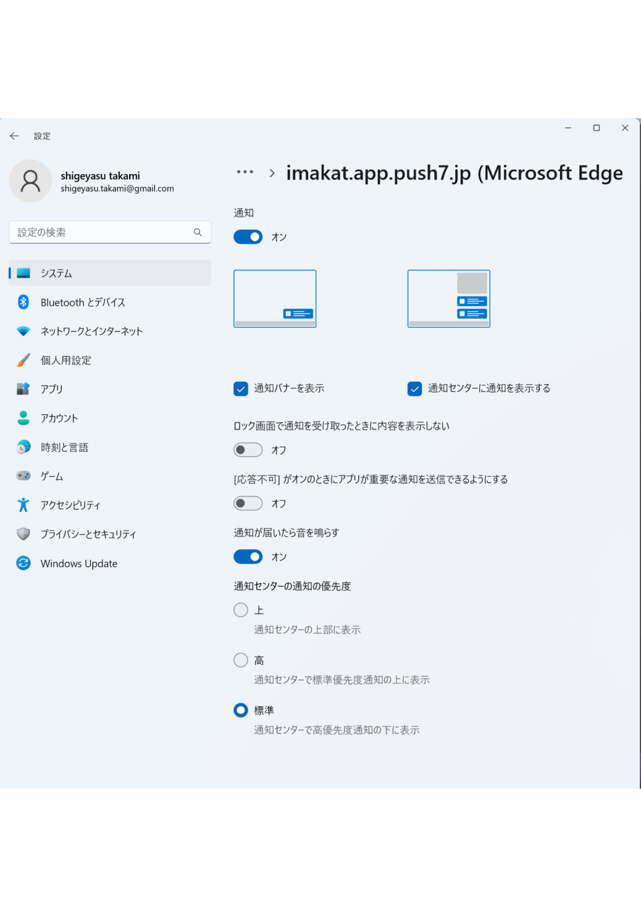 Edgeの場合、Windowsのシステム→「通知」の中に、URLが登録されます。