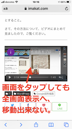 上記の設定で、YouTubeをスマホで再生しますと、画面をタップしても、全画面表示へ移動出来ないので、焦るかも知れません。